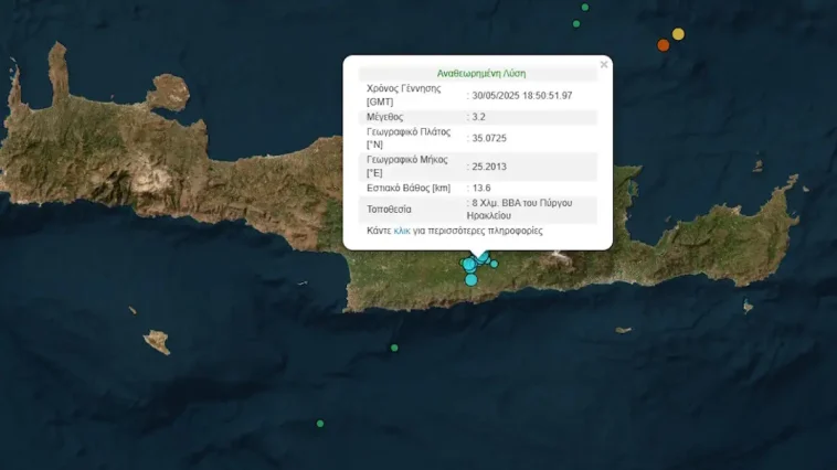 Σεισμός μεγέθους 3,2 Ρίχτερ σημειώθηκε το βράδυ της Παρασκευής στον Πύργο στο Ηράκλειο, Κρήτης.