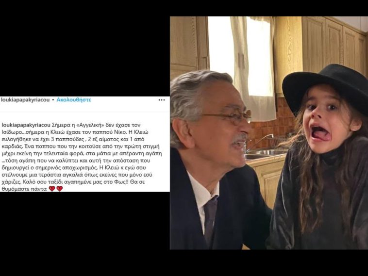 «Σήμερα η «Αγγελική» δεν έχασε τον Ισίδωρο…σήμερα η Κλειώ έχασε τον παππού Νίκο. Η Κλειώ ευλογήθηκε να έχει 3 παππούδες , 2 εξ αίματος και 1 από καρδιάς. Έναν παππού που την κοιτούσε από την πρώτη στιγμή μέχρι εκείνη την τελευταία φορά, στα μάτια με απέραντη αγάπη …τόση αγάπη που να καλύπτει και αυτή την απόσταση που δημιουργεί ο σημερινός αποχωρισμός. Η Κλειώ κ εγώ σου στέλνουμε μια τεράστια αγκαλιά όπως εκείνες που μόνο εσύ χάριζες. Καλό σου ταξίδι αγαπημένε μας στο Φως!! Θα σε θυμόμαστε πάντα».