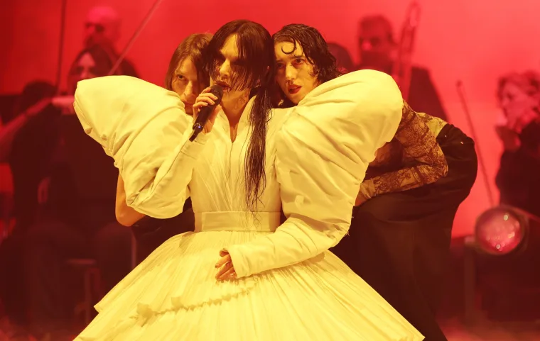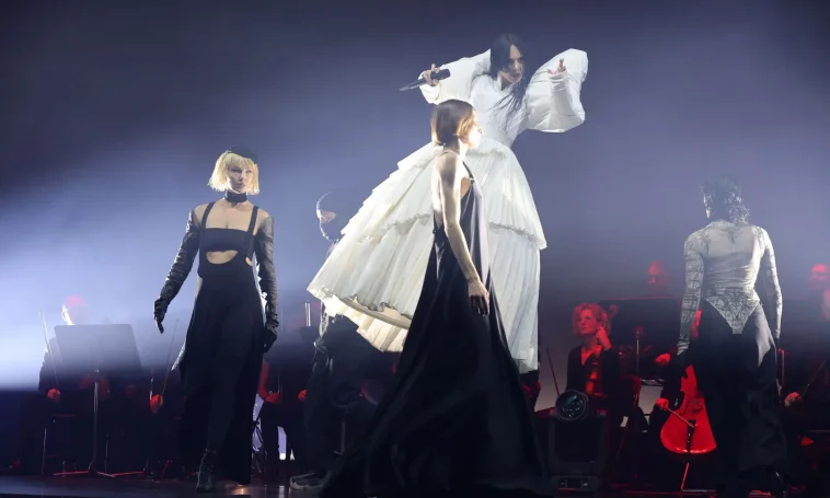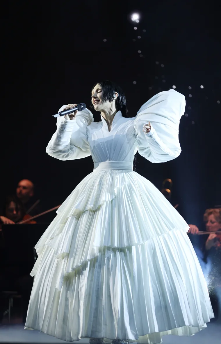 Αρχικά εμφανίστηκε με μια εντυπωσιακή λευκή τουαλέτα άλλης εποχής, με επιβλητικά, υπερμεγέθη μανίκια που θύμιζαν κινηματογραφικό κοστούμι. Ο συνδυασμός της ρομαντικής αισθητικής με το σύγχρονο performance στοιχείο δημιούργησε μια ατμόσφαιρα σχεδόν μαγική, σαν να κατέβηκε στη σκηνή ένα… ξωτικό της μουσικής.