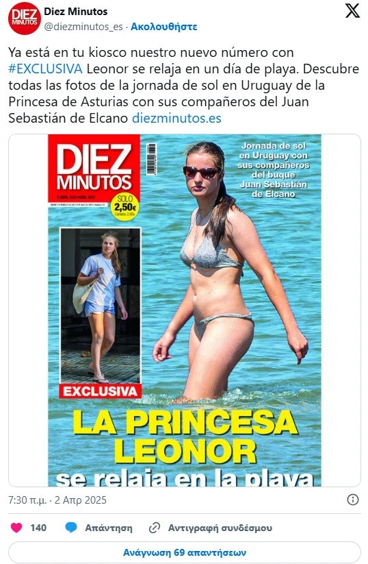 «Το στέμμα βαραίνει πολύ, κάτι που η Leonor της Ισπανίας βιώνει αυτές τις μέρες με πόνο. Φωτογραφίες με μπικίνι της 19χρονης εμφανίστηκαν στο εξώφυλλο ενός περιοδικού. Η ιδιωτική ζωή της 19χρονης πριγκίπισσας παραβιάστηκε ξανά, και αυτήν τη φορά ακόμη πιο δραστικά: το περιοδικό “Diez Minutos” δημοσίευσε φωτογραφίες παπαράτσι που δείχνουν τη Leonor με μπικίνι σε παραλία της Ουρουγουάης. Οι εικόνες πρέπει να τραβήχτηκαν κατά τη διάρκεια της άδειας παραλίας, καθώς η Leonor ολοκληρώνει αυτή τη στιγμή τη στρατιωτική της εκπαίδευση στο εκπαιδευτικό πλοίο Juan Sebastián de Elcano».