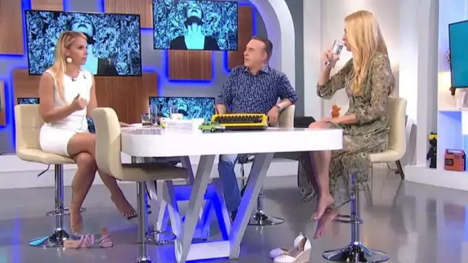 «Να σου πω και κάτι; Τι τα φοράμε τα τακούνια εδώ μεσημεριάτικα; Κι εγώ μη νομίζεις με τις παντόφλες μπαίνω απλά μετά βάζω τα τακούνια», πρόσθεσε η παρουσιάστρια, με τη Σοφία Μανωλάκου να λέει χαριτολογώντας: «Αφού καθόμαστε, βρε παιδιά, ποιος μας βλέπει;».