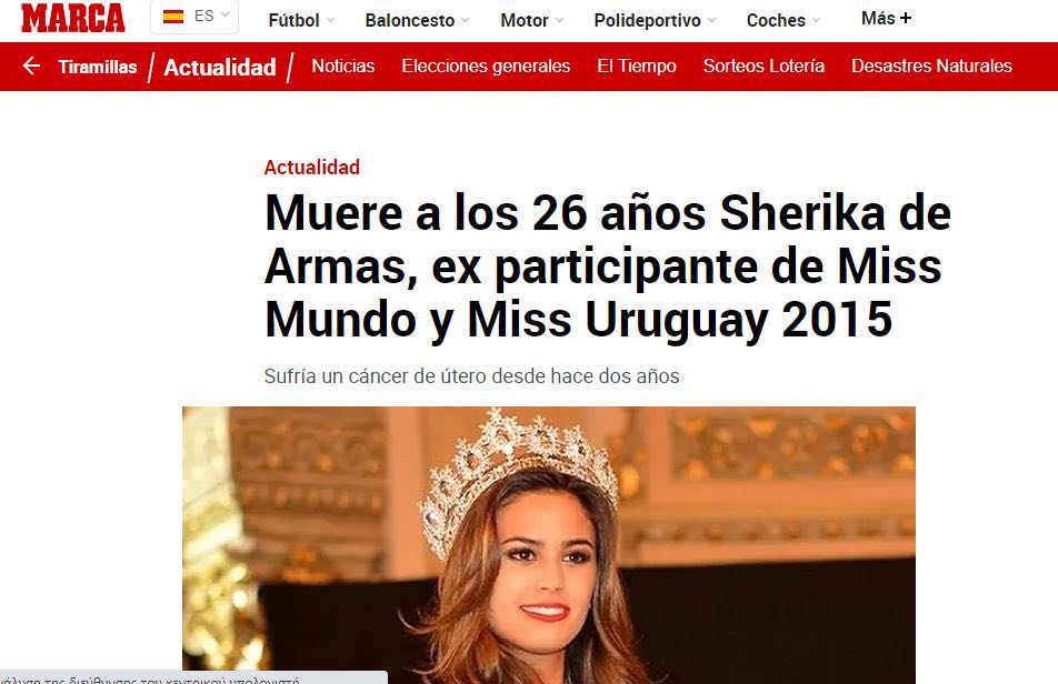 Έπειτα από διετή μάχη με τον καρκίνο, η Ουρουγουανή Sherika De Armas, υποψήφια στον διαγωνισμό Miss World το 2015, πέθανε μόλις στα 26 της χρόνια.