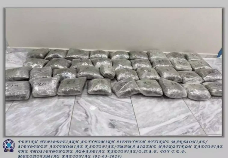 Στο πλαίσιο συντονισμένης αστυνομικής επιχείρησης για την καταπολέμηση της εισαγωγής και διακίνησης ναρκωτικών ουσιών στη χώρα και κατόπιν κατάλληλης αξιοποίησης στοιχείων, εντοπίστηκε σε περιοχή της Κοζάνης, Δ.Χ.Ε. αυτοκίνητο, με οδηγό τον 47χρονο και σε έλεγχο που πραγματοποιήθηκε, βρέθηκαν εντός του οχήματος 2 ταξιδιωτικοί σάκοι.