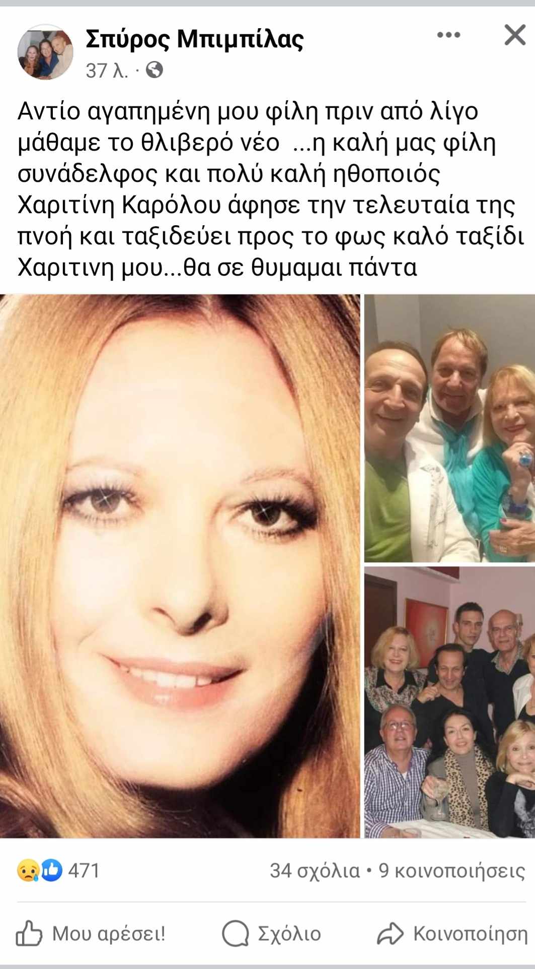 Αντίο αγαπημένη μου φίλη πριν από λίγο μάθαμε το θλιβερό νέο …η καλή μας φίλη συνάδελφος και πολύ καλή ηθοποιός Χαριτίνη Καρόλου άφησε την τελευταία της πνοή και ταξιδεύει προς το φως καλό ταξίδι Χαριτινη μου…θα σε θυμαμαι πάντα