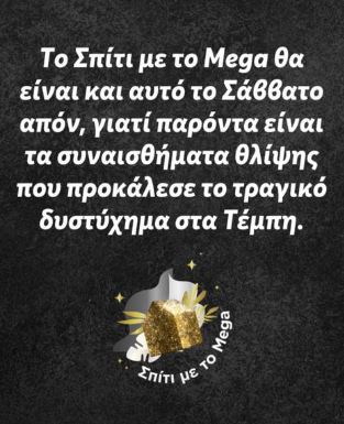 - Χθες το βράδυ μάλιστα, στον λογαριασμό της εκπομπής στο Instagram αναρτήθηκε η παρακάτω ανακοίνωση «Το Σπίτι με το Mega θα είναι και αυτό το Σάββατο απόν, γιατί παρόντα είναι τα συναισθήματα θλίψης που προκάλεσε το τραγικό δυστύχημα στα Τέμπη».