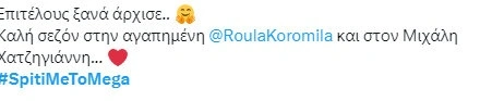 Το πιο φιλόξενο σπίτι της ελληνικής τηλεόρασης ανοίγει τις πόρτες του ξανά. Το «Σπίτι με το MEGA», η αγαπημένη μουσική συνήθεια που γέμισε τα βράδια μας με τραγούδια και μελωδίες σπουδαίων δημιουργών και ερμηνευτών του ελληνικού πενταγράμμου επέστρεψε.Η Ρούλα Κορομηλά και ο Μιχάλης Χατζηγιάννης σε μια ξεχωριστή συνύπαρξη μάς χαρίζουν μοναδικές στιγμές αυθορμητισμού, κεφιού, χορού και τραγουδιού μαζί με τους εκλεκτούς καλεσμένους που υποδέχονται στο ανανεωμένο σκηνικό της εκπομπής τους.