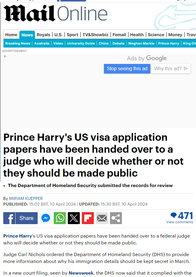 - Σύμφωνα με το περιοδικό Newsweek, ο δικαστής που έχει στα χέρια του την αίτηση του πρίγκιπα Χάρι, ο δικαστής Καρλ Νίκολς, θα την εξετάσει και μετέπειτα θα αποφασίσει αν θα την κοινοποιήσει δημόσια ή όχι, αν και η υπηρεσία έχει δηλώσει πρόσφατα ότι δεν σκοπεύει να τη δώσει στη δημοσιότητα. Ο Χάρι από τον Μάρτιο του 2020 μένει στην Καλιφόρνια μαζί με τη σύζυγό του, Μέγκαν Μαρκλ, και τα δύο τους παιδιά. Στην αυτοβιογραφία του, «Spare», ανέφερε πως από μικρή ηλικία είχε κάνει χρήση κοκαΐνης, κάνναβης, καθώς και ψυχεδελικών μανιταριών, μόνο και μόνο για να νιώσει «διαφορετικός». Να τονιστεί πως για τον ίδιο λόγο στο παρελθόν, όπως αναφέρει το Newsweek, διασημότητες όπως η Έιμι Γουάινχαουζ και η Κέιτ Μος αντιμετώπιζαν πρόβλημα στο να πάρουν άδεια παραμονής στις ΗΠΑ.