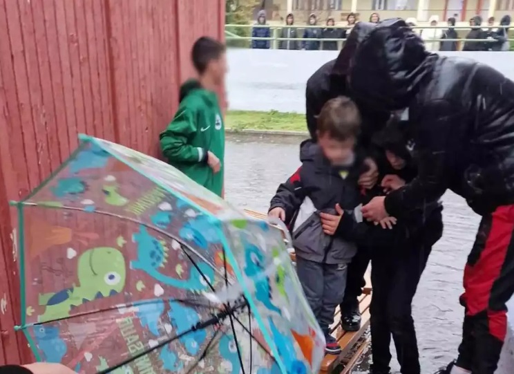 Στο σημείο εκτός από τους εκπαιδευτικούς, βοήθησαν και μαθητές του Γυμνασίου στήνοντας γέφυρα με τα παγκάκια του νηπιαγωγείου και πέρασαν έτσι με ασφάλεια τα παιδιά στην έξοδο.