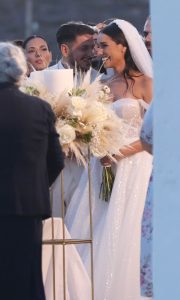 - Η νύφη έλαμπε μέσα στο υπέροχο λευκό νυφικό της ενώ και ο γαμπρός έδειχνε πολύ ευτυχισμένος, έχοντας επιλέξει ένα απλό αλλά πολύ κομψό κουστούμι, σε ιβουάρ χρώμα το οποίο είχε συνδυάσει με καφέ λεπτομέρειες.