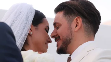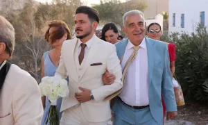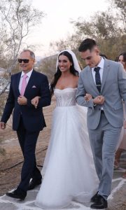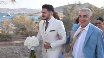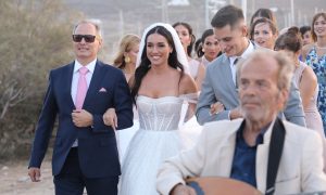 - Η νύφη έλαμπε μέσα στο υπέροχο λευκό νυφικό της ενώ και ο γαμπρός έδειχνε πολύ ευτυχισμένος, έχοντας επιλέξει ένα απλό αλλά πολύ κομψό κουστούμι, σε ιβουάρ χρώμα το οποίο είχε συνδυάσει με καφέ λεπτομέρειες.
