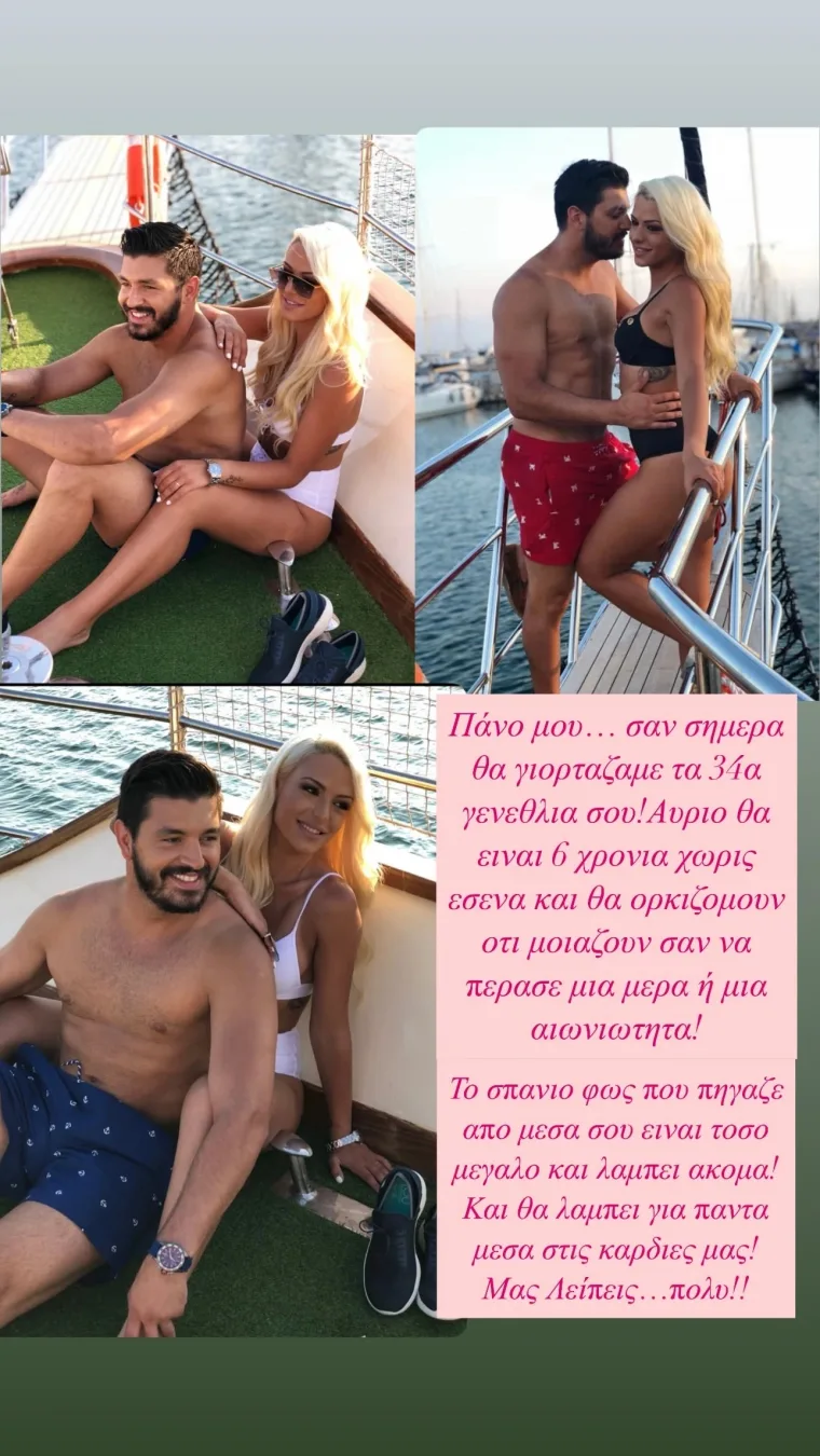 Στην ανάρτησή της, η Στέλλα έγραψε: «Πάνο μου… σαν σήμερα θα γιορτάζαμε τα 34α γενέθλιά σου! Αύριο θα είναι 6 χρόνια χωρίς εσένα και θα ορκιζόμουν ότι μοιάζουν σαν μα πέρασε μια μέρα ή μια αιωνιότητα! Το σπάνιο φως που πήγαζε από μέσα σου είναι τόσο μεγάλο και λάμπει ακόμα! Και θα λάμπει για πάντα μέσα στις καρδιές μας! Μας λείπεις… πολύ!».