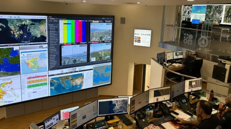 Στη διπλανή αίθουσα, η UNIT2 – που εποπτεύει τα εναέρια μέσα – δίνει άμεσα εντολές για επέμβαση. Σήμερα, 45 αεροσκάφη και ελικόπτερα επιχειρούν σε κύκλους σε όλη τη χώρα: 18 στην Αχαΐα, 7 στη Χίο, 5 στη Ζάκυνθο, 5 στη Φιλιππιάδα, ενώ τα υπόλοιπα καλύπτουν μικρότερα μέτωπα.