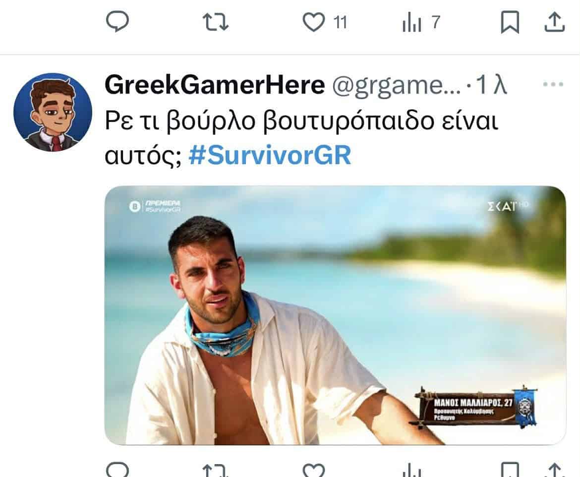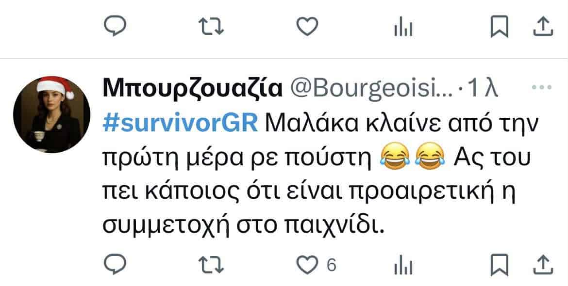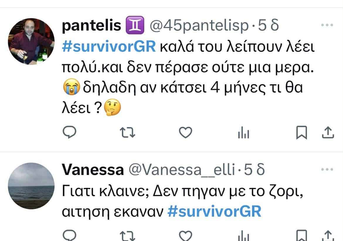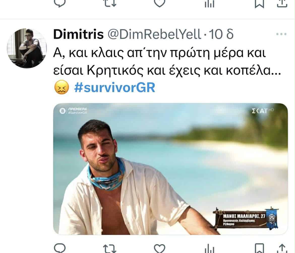 “Από την πρώτη μέρα κιόλας κλάματα; Τι περίμενες, να σου έχουν και στεγνωτήριο; Καλά είσαι Κρητικός, έχεις και κοπέλα, και κάθεσαι και κλαις έτσι από το πρώτο λεπτό; Ντροπιάζεις την Κρήτη. Πολλά τα σχόλια, αλλά πραγματικά το όλο σκηνικό είναι απλά για γέλια.