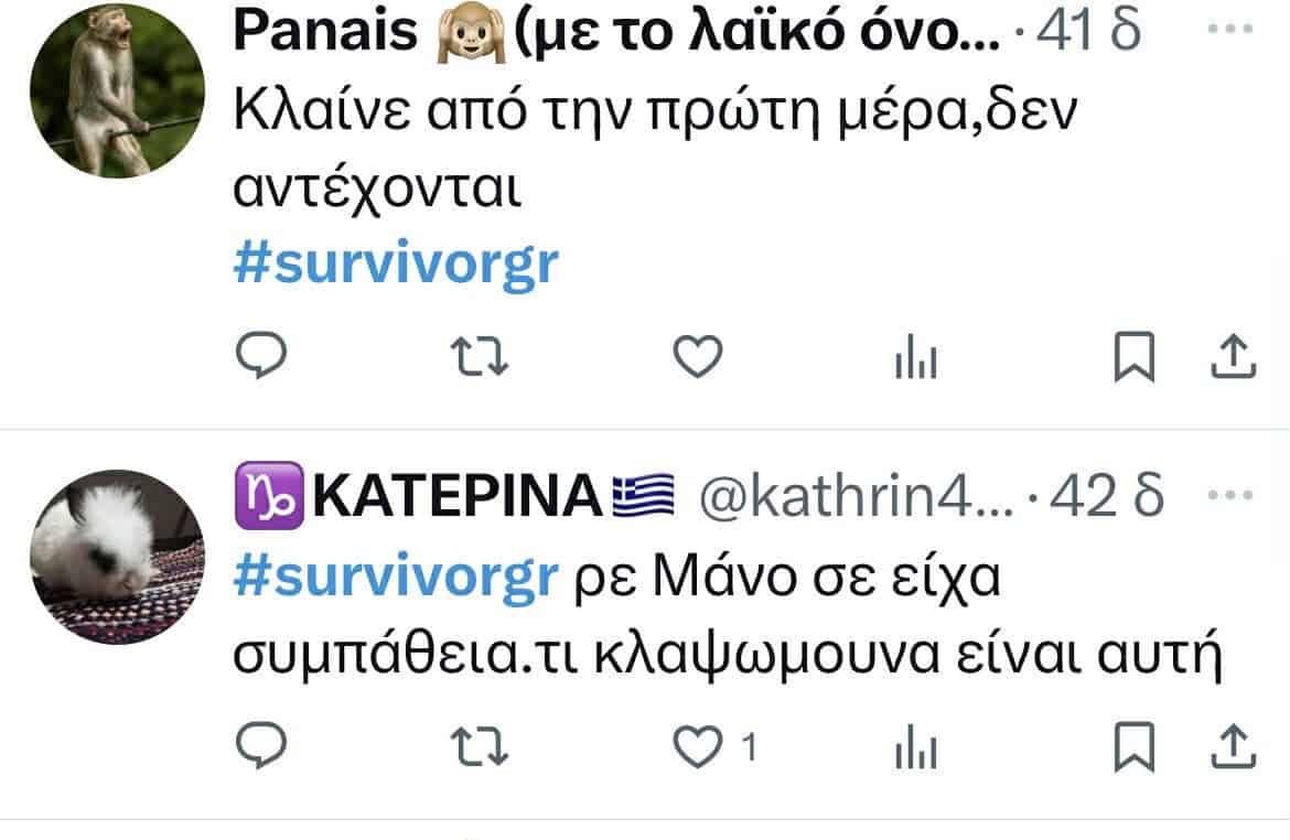 - Βέβαια, όποιος έχει στοιχειώδη αντίληψη καταλαβαίνει ότι όλο αυτό ήταν εντελώς ψεύτικο. Με λυγμούς έλεγε πόσο δύσκολα είναι, γιατί οι προηγούμενοι παίκτες στα προηγούμενα survivor είχαν έστω ένα αδιάβροχο ή φωτιά, ενώ εκείνοι δεν έχουν τίποτα.