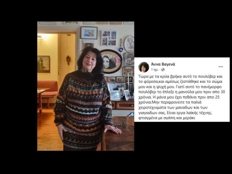 Την μητέρα της θυμήθηκε η Άννα Βαγενά που ποζάρει στα 78 της χρόνια φορώντας ένα πουλόβερ που της είχε πλέξει πριν απο χρόνια.