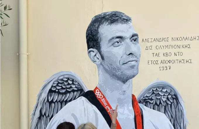 Συγκίνηση προκαλεί το γκράφιτι του καλλιτέχνη Μάριου Σιμόπουλου στον τοίχο του 1ου Γυμνασίου – Λυκείου Σταυρούπολης, εκεί απ’ όπου αποφοίτησε το 1997 ο ολυμπιονίκης Αλέξανδρος Νικολαΐδης.