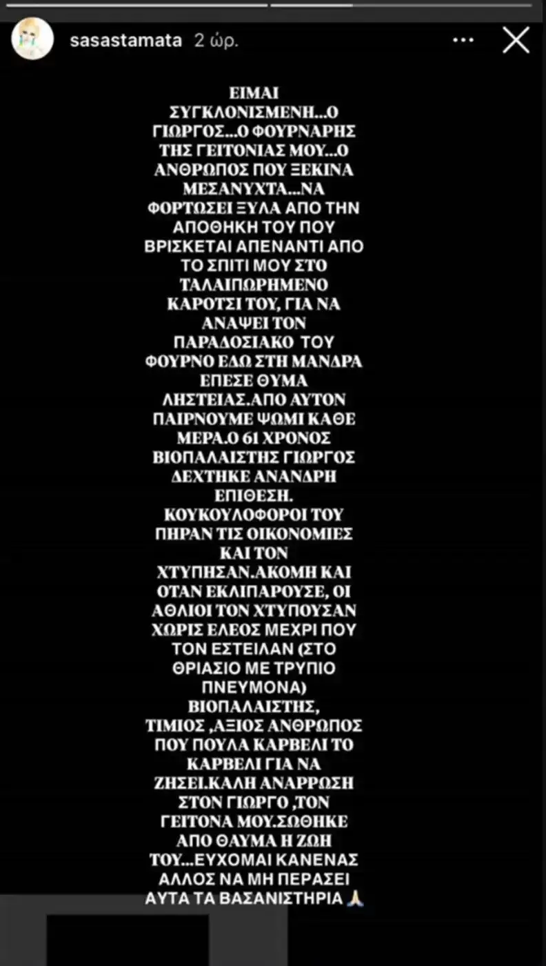 «Κουκουλοφόροι του πήραν τις οικονομίες και τον χτύπησαν. Ακόμη και όταν εκλιπαρούσε, οι άθλιοι τον χτυπούσαν χωρίς έλεος μέχρι που τον έστειλαν στο Θριάσιο με τρύπιο πνεύμονα. Βιοπαλαιστής, τίμιος, άξιος άνθρωπος που πουλά καρβέλι το καρβέλι για να ζήσει. Καλή ανάρρωση στον Γιώργο, τον γείτονά μου. Σώθηκε από θαύμα η ζωή του… Εύχομαι κανένας άλλος να μη περάσει αυτά τα βασανιστήρια», κατέληξε η Σάσα Σταμάτη.