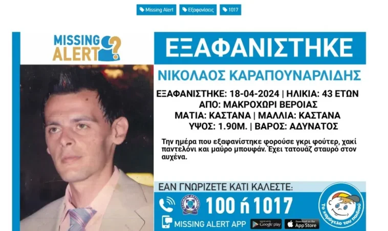 Συναγερμός έχει σημάνει στη Βέροια για την εξαφάνιση ενός 43χρονου άνδρα από το Μακρυχώρι. Το «Χαμόγελο του Παιδιού» εξέδωσε σήμερα Δευτέρα 22 Απριλίου missing Alert, για την εξαφάνιση από τις 18 Απριλίου 2024, του Καραπουναρλίδη Νικόλαου 43 ετών μετά από αίτημα της οικογένειάς του, καθώς ενδέχεται να συντρέχουν λόγοι, οι οποίοι θέτουν τη ζωή του σε κίνδυνο. Ο Καραπουναρλίδης Νικόλαος έχει ύψος 1.90 μ., είναι αδύνατος, έχει καστανά μαλλιά και καστανά μάτια. Την ημέρα που εξαφανίστηκε φορούσε γκρι φούτερ, χακί παντελόνι και μαύρο μπουφάν. Φέρει τατουάζ – σταυρό στον αυχένα. Οποιοσδήποτε έχει κάποια πληροφορία, παρακαλείται να επικοινωνήσει τηλεφωνικά με «Το Χαμόγελο του Παιδιού» όλο το 24ωρο, στην «Εθνική Γραμμή για τους Αγνοούμενους Ενήλικες – 1017», σε όλα τα Αστυνομικά Τμήματα της χώρας αλλά και μέσω της εφαρμογής Missing Alert app οπού υπάρχει ζωντανή ενημέρωση για την εξαφάνιση.