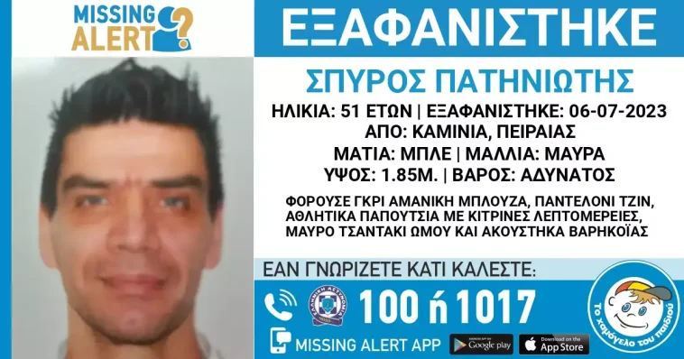 Σε συναγερμό έχουν τεθεί οι Αρχές από την εξαφάνιση του 51χρονου Σπύρου Πατηνιώτη στα Καμίνια του Πειραιά το απόγευμα της Πέμπτης 6 Ιουλίου.