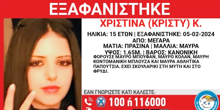 - Το «Χαμόγελο του Παιδιού» ενημερώθηκε και προχώρησε στη δημοσιοποίηση των στοιχείων της ανήλικης Χριστίνας από τα Μέγαρα, κατόπιν αιτήματος της οικογένειάς της, καθώς ενδέχεται να συντρέχουν λόγοι που θέτουν τη ζωή της σε κίνδυνο.
