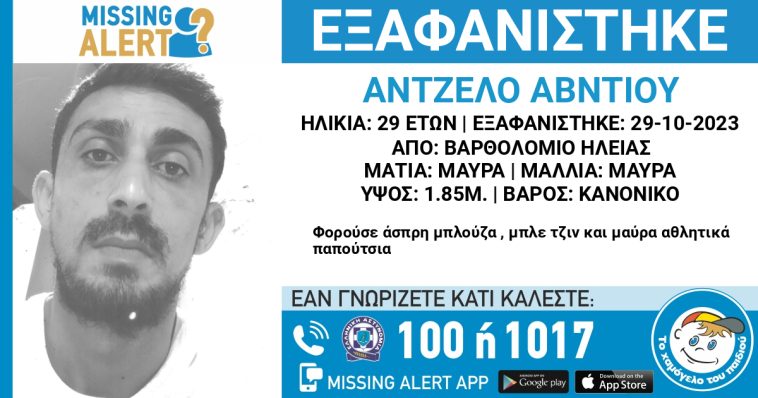 Στις 29/10/2023, πρωινές ώρες, εξαφανίστηκε από την περιοχή του Βαρθολομιού Ηλείας ο Άβντιου Άντζελο, 29 ετών, αλβανικής καταγωγής.