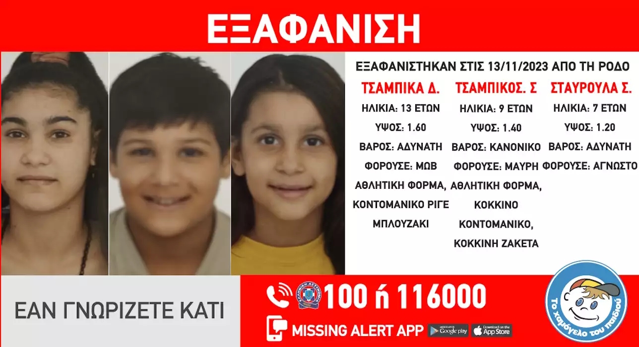 Συγκεκριμένα το μεσημέρι της Δευτέρας εξαφανίστηκαν από χώρο παιδικής προστασίας στην Ρόδο τα ανήλικα αδέρφια, Τσαμπίκα Δ., 13 ετών, Τσαμπίκος Σ. 9 ετών, και Σταυρούλα Σ. 7 ετών. «Το Χαμόγελο του Παιδιού» ενημερώθηκε για την εξαφάνιση των τριών αδερφών σήμερα, 15/11/2023, και προχώρησε στην δημοσιοποίηση των στοιχείων των ανηλίκων, καθώς ενδέχεται να συντρέχουν λόγοι που θέτουν την ζωή τους σε κίνδυνο.