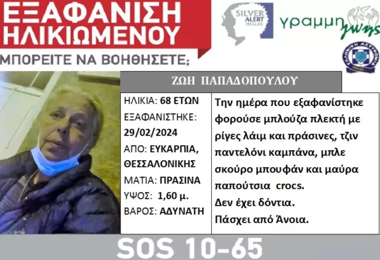 Πρόκειται για την Ζωή Παπαδοπούλου, 68 ετών, που εξαφανίστηκε από το σπίτι της, στην Ευκαρπία Θεσσαλονίκης, το πρωί της 29/02/2024.