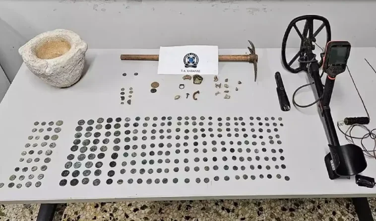 Από αστυνομικούς του Τμήματος Ασφάλειας Καβάλας, οι οποίοι αξιοποίησαν στοιχεία βρέθηκαν και εντοπίστηκαν 16 αρχαία αντικείμενα, 267 αρχαία νομίσματα και δύο ανιχνευτές μετάλλων.