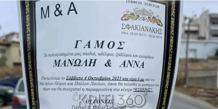 Ο γαμπρός, ιδιοκτήτης του γνωστού γραφείου τελετών Σφακιανάκη στα Χανιά, αποφάσισε να δώσει μια χιουμοριστική και ταυτόχρονα διαφημιστική πινελιά στο χαρμόσυνο γεγονός.