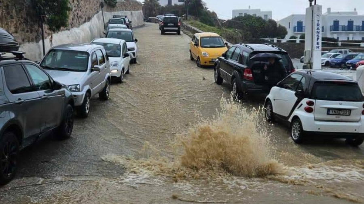 Κακοκαιρία στη Μύκονο – Πλημμύρισαν ξανά οι δρόμοι από τις σφοδρές βροχοπτώσεις – Οδηγοί παλεύουν με τα ορμητικά νερά