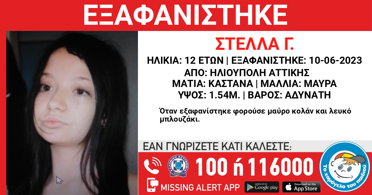 Στις 10/6/2023, μεσημβρινές ώρες εξαφανίστηκε από την περιοχή της Ηλιούπολης Αττικής, η Στέλλα Γ.,…