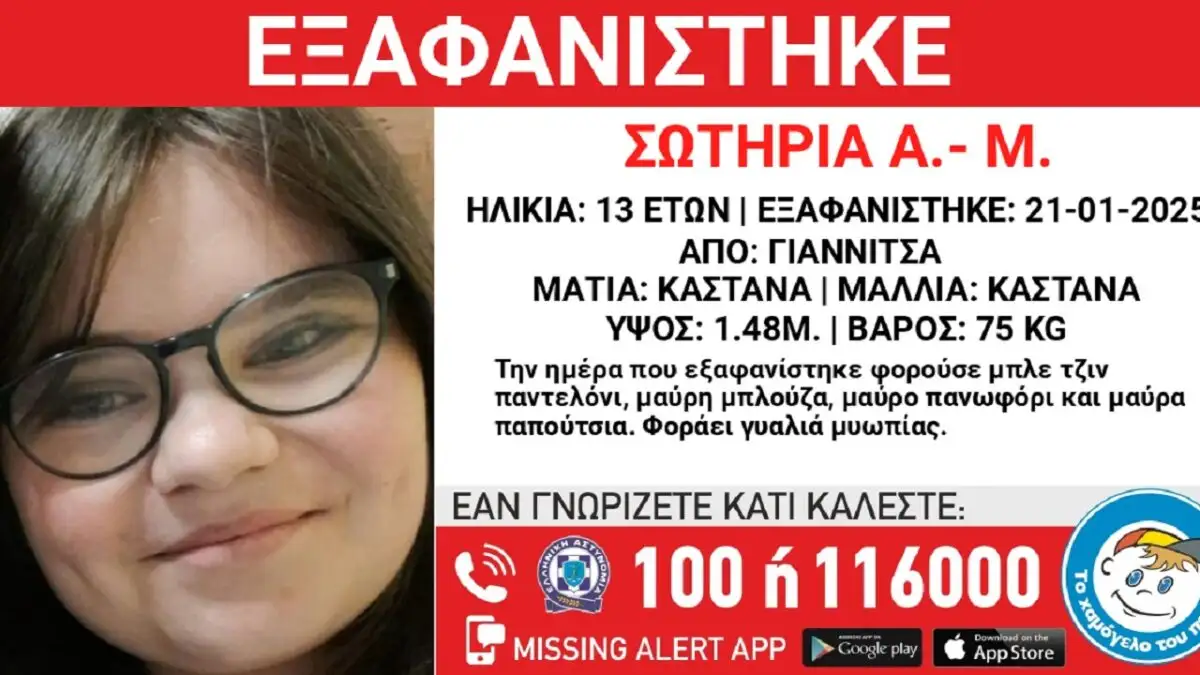 Συναγερμός έχει σημάνει στα Γιαννιτσά από την εξαφάνιση της 13χρονης Σωτηρίας όπως ανακοίνωσε το…