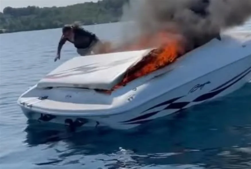 Τρομακτικό βίντεο – Ζευγάρι πηδάει από βάρκα που έχει τυλιχθεί στις φλόγες, λίγο πριν εκραγεί