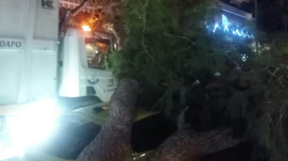 Παλαιό Φάληρο ΤΩΡΑ – Τεράστιο πεύκο έπεσε σε απορριμματοφόρο και αυτοκίνητο