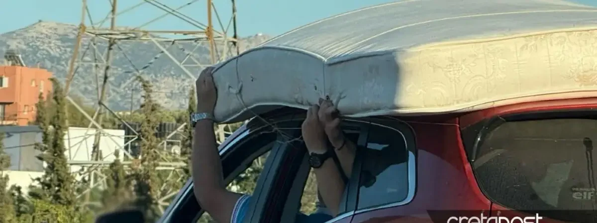 Κρήτη ΤΩΡΑ – Μετέφεραν στρώμα στην οροφή αυτοκινήτου και το κρατούσαν με τα χέρια τους