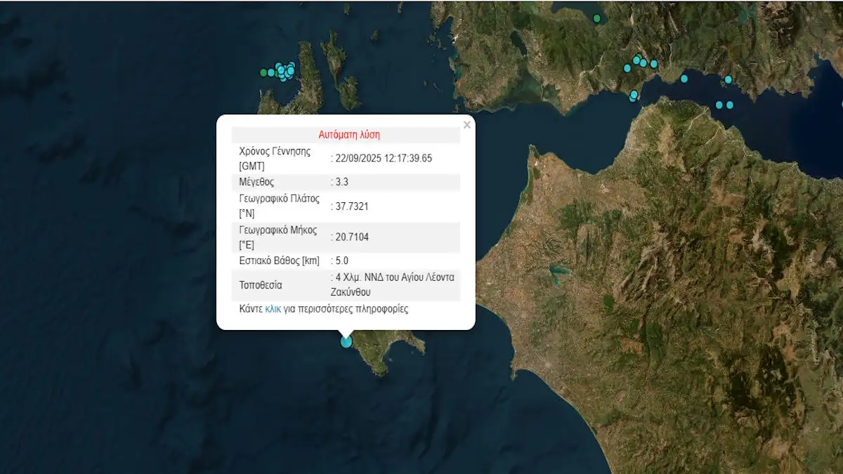 Σεισμός 3,3 Ρίχτερ εκδηλώθηκε σήμερα το μεσημέρι, Δευτέρα (22/9/2025), στη Ζάκυνθο, σύμφωνα με το…