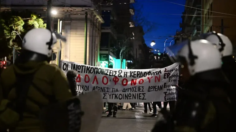 Διαδηλωτές μαζεύτηκαν μπροστά στο κτίριο της οδού Πετμεζά, όπου ήταν παραταγμένες και δυνάμεις των ΜΑΤ.