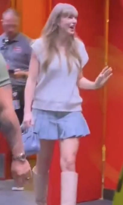 Ο Τράβις Κέλσι εμφανίστηκε αρχικά στον αγωνιστικό χώρο με κόκκινη-λευκή λινή μπλούζα και καπέλο των Bearcats, ενώ λίγο αργότερα η Σουίφτ έφτασε στη σουίτα τους, επιλέγοντας για την περίσταση ένα preppy look με λευκό πλεκτό τοπ, baby blue μίνι τζιν φούστα και off-white μπότες, κρατώντας τσάντα Celine σε ασορτί απόχρωση.
