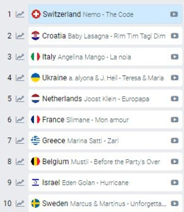 - Τις τελευταίες μέρες οι προβλέψεις θέλουν σίγουρα τη Μαρίνα Σάττι στη μεγάλη 10αδα της Eurovision, η ακριβής θέση όμως ανεβοκατεβαίνει διαρκώς. Η Ελληνική αποστολή και το Ζάρι που θα εκπροσωπήσει την χώρα μας στον μεγάλο διαγωνισμό της μουσικής βρίσκονται στην 7η θέση. Η Ελβετία είναι η χώρα που σύμφωνα με το eurovisionworld.com είναι πιο πιθανό να κερδίσει τον διαγωνισμό. Ακολουθούν, η Κροατία, η Ιταλία και η Ουκρανία, στις 2η, 3η και 4η θέση αντίστοιχα. Τα νέα είναι αρκετά δυσάρεστα για την Κύπρο και την Silia Kapsis, καθώς μένουν εκτός 20άδας για τα στοιχήματα, που τη θέλουν να «τερματίζει» πιθανότατα, 24η.
