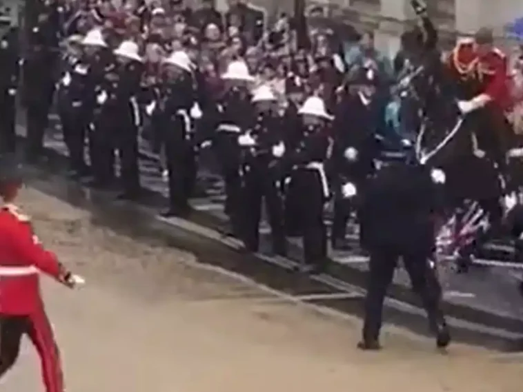 Την ώρα που η άμαξα του βασιλιά Καρόλου και της βασίλισσας Καμίλα περνούσε από ένα δρόμο κοντά στη Λεωφόρο Μολ για να πάει στο Μπάκιγχαμ μετά τη στέψη, ένα άλογο ταράχτηκε και άρχισενα κάνει πίσω βήματα και κύκλους, τρέχοντας προς τους στρατιώτες και το πλήθος που ήταν στην άκρη του δρόμου.