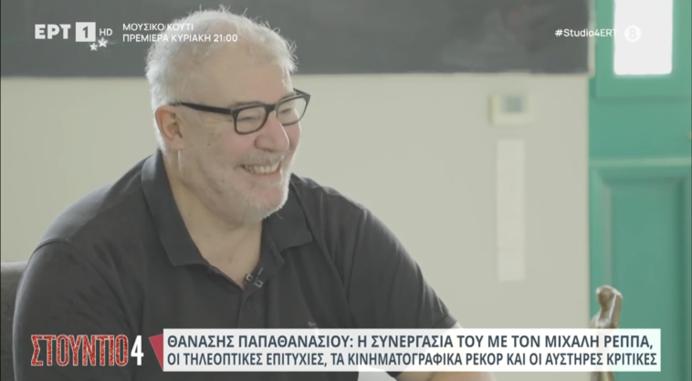 Ο Θανάσης Παπαθανασίου μίλησε στην εκπομπή Στούντιο 4 και τη Φανή Πλατσατούρα, από τη σπάνιες φορές χωρίς τον Μιχάλη Ρέππα, για τη συνεργασία τους, τις Τρεις Χάριτες, τηλεοπτικές επιτυχίες, κινηματογραφικά ρεκόρ και τις αυστηρές κριτικές.