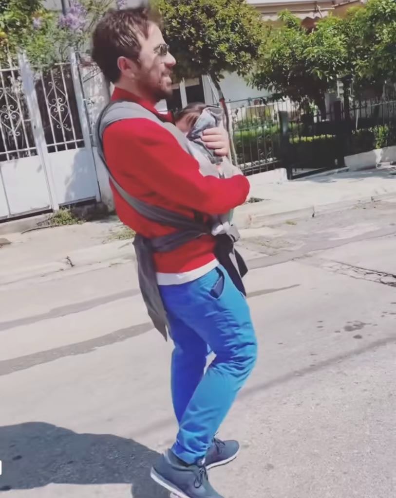 - Δείτε την πρώτη εμφάνιση με τη κόρη του με τον ηθοποιό να φοράει μάρσιππο και να προχωρά χαρούμενος και ευτυχής ενώ η σύζυγός του τον φωτογραφίζει. Στη συνέχεια έγινε το αντίθετο αφού εκείνος τραβούσε βίντεο την Αγοραστή που πήγαινε βόλτα τον σκύλος του.