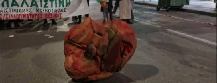 Μία περίεργη εικόνα αντίκρισαν οι συμμετέχοντες στην αποψινή πορεία για το Πολυτεχνείο στη Θεσσαλονίκη.Μέσα στον δρόμο και ανάμεσα από τους διαδηλωτές έκανε την εμφάνισή της μία μεγάλη κόκκινη μπάλα, φτιαγμένη πιθανότατα από ύφασμα, η οποία κινούνταν διαρκώς, προκαλώντας την εύλογη απορία του κόσμου, σύμφωνα με όσα αναφέρει το grtimes.Πολλοί ήταν αυτοί που προσπάθησαν να δουν αν μέσα υπήρχε κάποιος άνθρωπος ή κάποιο ζώο, με τους περαστικούς να βλέπουν το σπάνιο αυτό θέαμα και να γελούν.