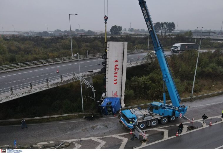 Συγκλονιστικές είναι οι εικόνες από την επιχείρηση που έχει στηθεί ώστε γερανός να καταφέρει να απομακρύνει την νταλίκα που έπεσε νωρίτερα από γέφυρα στη Θεσσαλονίκη. Ολοκληρώνεται αυτή την ώρα η επιχείρηση της απομάκρυνσης της νταλίκας που βρέθηκε στο κενό, αφού ο 62χρονος οδηγός της έχασε τον έλεγχο του οχήματος με αποτέλεσμα αυτή να προσγειωθεί καθέτως όπως φαίνεται στο οδόστρωμα, επί της ΠΑΘΕ, στην έξοδο από την εξωτερική Περιφερειακή Οδό της πόλης.