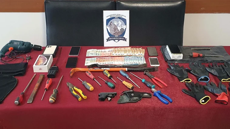 - Σύμφωνα με ανακοίνωση της Αστυνομίας, ταυτοποιήθηκαν ως δράστες και συνελήφθησαν τρεις αλλοδαποί ηλικίας 29, 33 και 34 ετών και δύο ημεδαποί ηλικίας 27 και 26 ετών (άντρας – γυναίκα αντίστοιχα), σε βάρος των οποίων, σχηματίσθηκε δικογραφία, κατά περίπτωση, για εγκληματική οργάνωση – συμμορία, διακεκριμένες κλοπές, «ρύθμιση θεμάτων που αφορούν όπλα, πυρομαχικά, εκρηκτικές ύλες, εκρηκτικούς μηχανισμούς και άλλες διατάξεις», «παρακολούθηση ραδιοφάσματος – μη δημόσιες διαβιβάσεις» και νομοθεσία «περί εξαρτησιογόνων ουσιών».