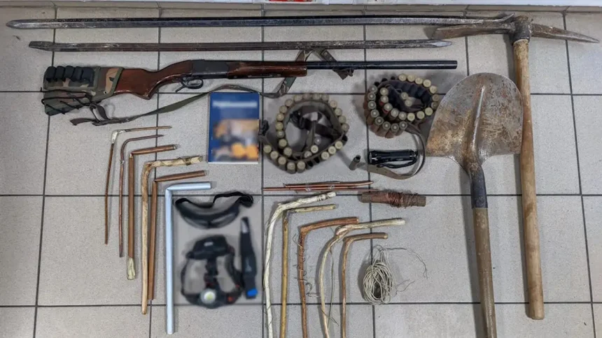 Σε έρευνες που έγιναν στον χώρο, σε σπίτια των κατηγορουμένων, όπως και σε σωματικές έρευνες, βρέθηκαν και κατασχέθηκαν φτυάρι, αξίνα και δύο μεταλλικοί λοστοί, κυνηγετική καραμπίνα με 50 φυσίγγια και μαχαίρι, αυτοσχέδιες ξύλινες και μεταλλικές ράβδοι διασκόπησης υπεδάφους, φακός κεφαλής, φακός, καλώδια, ζεύγος προστατευτικών γυαλιών εργασίας και βιβλίο ραβδοσκοπίας.