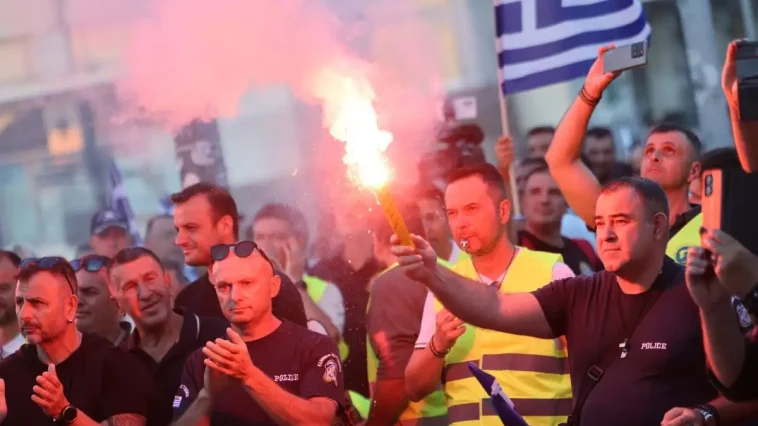 Με πυρσούς, σφυρίχτρες, κόρνες και συνθήματα κατέληξε μπροστά στο ΥΜΑΘ η πορεία διαμαρτυρίας που πραγματοποίησαν στο κέντρο της Θεσσαλονίκης το απόγευμα της Παρασκευής (05.09.2025) οι ένστολοι των Σωμάτων Ασφαλείας και των Ενόπλων Δυνάμεων.