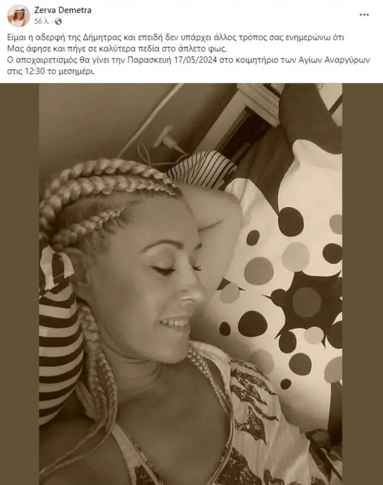 Η ανάρτηση του Σπύρου Μπιμπίλα: H είδηση του θανάτου της Δήμητρας Ζέρβα, έγινε αρχικά γνωστή από την αδερφή της, η οποία χρησιμοποίησε το προφίλ της για να ανακοινώσει τα δυσάρεστα, γράφοντας: «Είμαι η αδερφή της Δήμητρας και επειδή δεν υπάρχει άλλος τρόπος, σας ενημερώνω ότι μας άφησε και πήγε σε καλύτερα πεδία στο άπλετο φως. Ο αποχαιρετισμός θα γίνει την Παρασκευή 17/05/2024 στο κοιμητήριο των Αγίων Αναργύρων στις 12:30 το μεσημέρι».