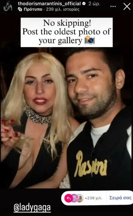 Η φωτογραφία «βγήκε από το συρτάρι», στο πλαίσιο της νέας τάσης στα social media, με χρήστες να ανεβάζουν ένα από τα πιο παλιά στιγμιότυπα που έχουν στο κινητό τους. Σε ένα trend στο οποίο συμμετείχε και ο Θοδωρής Μαραντίνης, ο οποίος και επέλεξε να δημοσιεύσει μία φωτογραφία στην οποία ποζάρει μαζί με τη Lady Gaga.