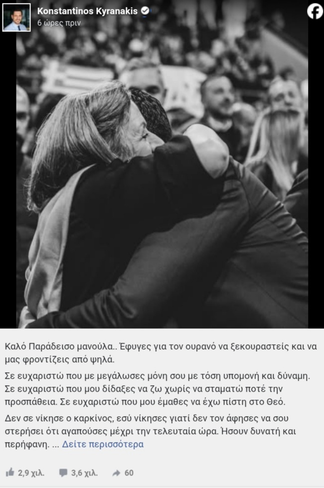 Δύσκολες ώρες περνά η οικογένεια του Κωνσταντίνου Κυρανάκη, που έχασε τη μητέρα του μετά από γενναία μάχη με τον καρκίνο.
